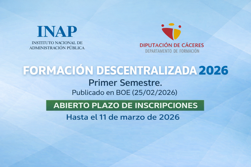 El Departamento de Formación de Diputación de Cáceres en el marco de la convocatoria de actividades formativas descentralizadas programadas para el primer semestre de 2026 del Instituto Nacional de Administración Pública (INAP) bajo la convocatoria aprobada por Resolución de 17 de febrero de 2026, convoca la siguiente acción formativa: La problemática de las subvenciones a […]