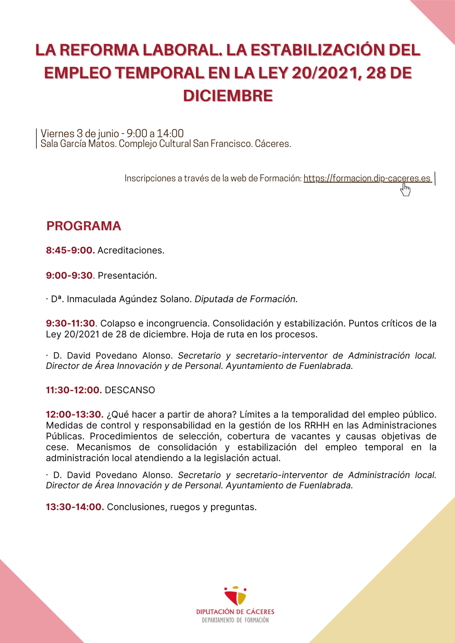 El Departamento de Formación de Diputación de Cáceres vuelve a poner en marcha una Jornada formativa presencial en materia de estabilización de empleo temporal dentro de su Plan de Formación 2022.
