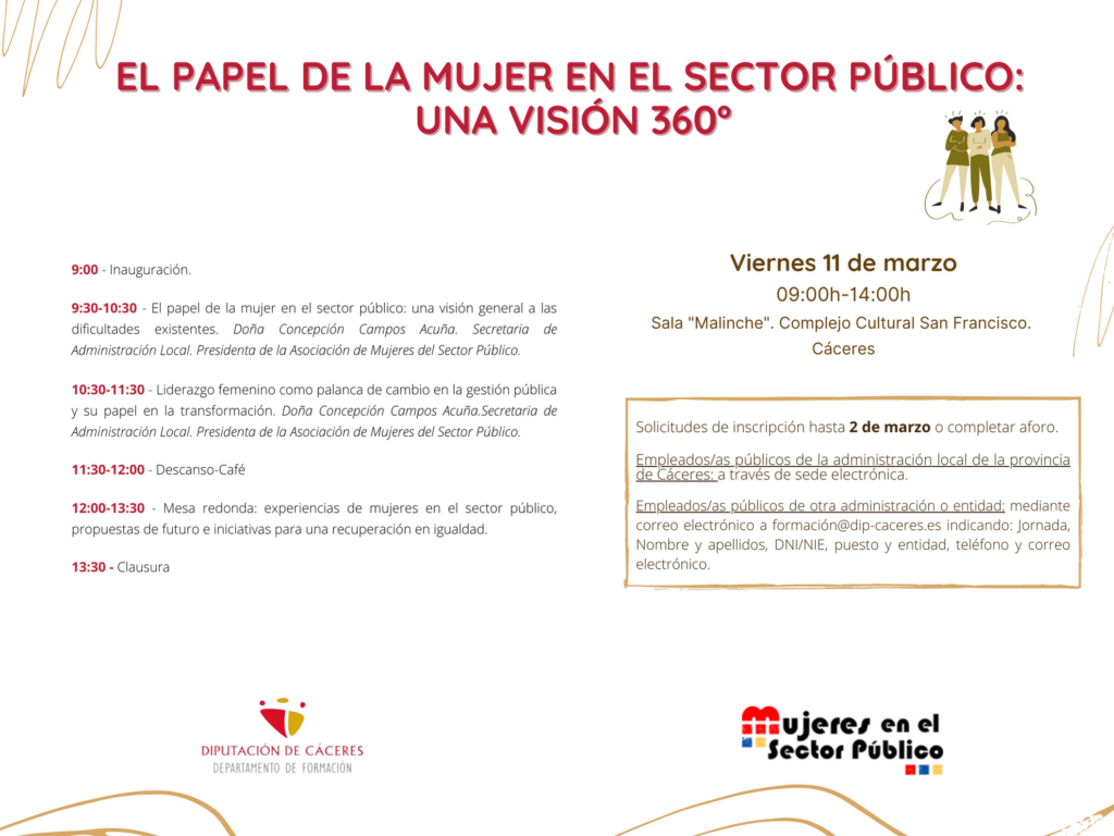 Desde el Departamento de Formación de Diputación de Cáceres tenemos el placer de invitaros a participar en las próximas jornadas formativas El papel de la mujer en el sector público: una visión 360º que desarrollaremos con el objetivo de dotar a las personas asistentes del conocimiento sobre el estado real de la igualdad de género en el sector público, donde, a pesar de las garantías legales y de las metas fijadas en el ODS 5, no existe todavía igualdad real, sigue siendo necesario adoptar medidas y líneas de acción positiva para alcanzarla, máximo en los niveles directivos.